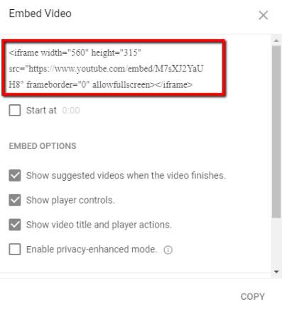 4. En la ventana emergente, verá un código. Copie y pegue este código en el código fuente de su publicación o página de WordPress. (Vea los pasos 5-7 del ejemplo para YouTube).