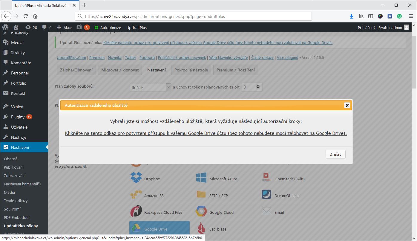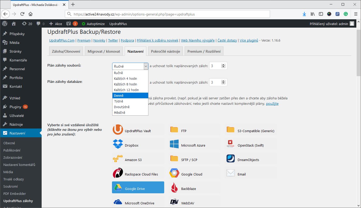 - Next, you can choose where the backup will be stored. Cloud storage such as Google Drive, FTP or Dropbox is ideal. The free Google Drive with a capacity of more than 15 GB is preferred. Such capacity is usually sufficient to back up your site. You can choose from 16 storage options.