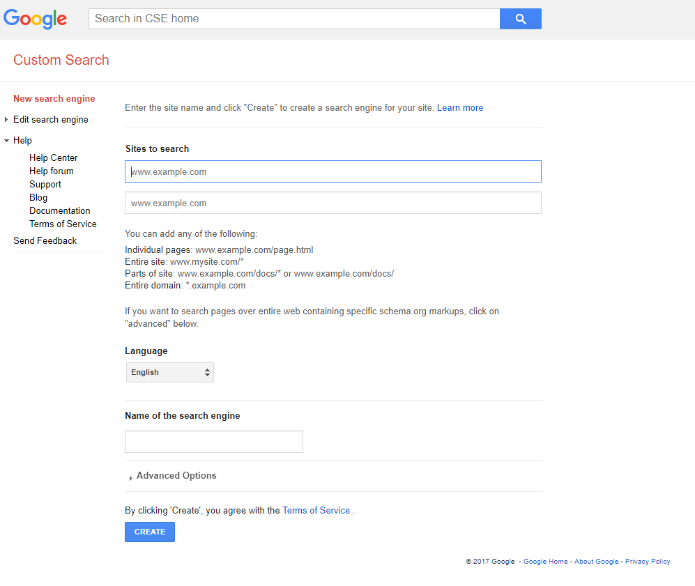 5. Click on the "Create" button to continue. Google will now create your custom search engine and will show you a success message with links to further actions.